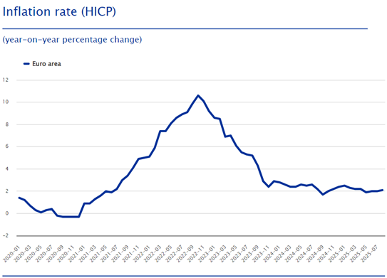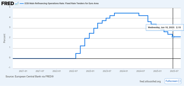 2.15% מתאריך 11/07/25. הבנק המרכזי באירופה מוריד באופן תכוף את הריבית כבר מעל לשנה, לדברי מועצת הנגידים האירופית החלטת הריבית תלויה בעמידה בשיעור אינפלציה של כ2% שנתי.